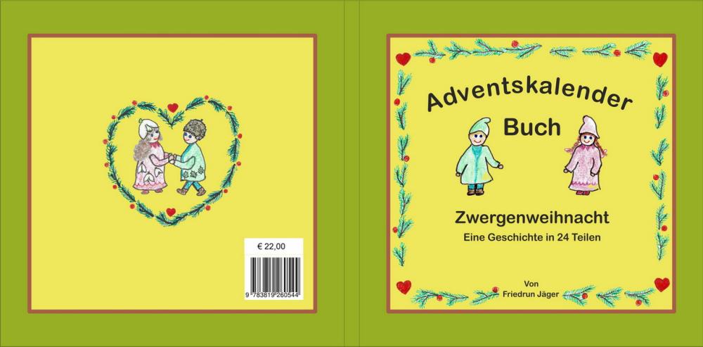 Unser Mitglied Friedrun Jäger hat gerade ein neues Kinderbuch herausgebracht: das Adventskalender-Buch „Zwergenweihnacht“, eine Geschichte in 24 Teilen, liebevoll illustriert von der Autorin selbst. Es geht dabei um einen Zwerg, dem in der Vorweihnachtszeit langweilig wird und der mit seiner Freundin, einem Zwergenmädchen, ein großes Fest mit allen Tieren im Wald plant. Das Wesentliche dabei ist das friedliche Beisammensein und das Teilen, die wichtigen Dinge, die auch für uns Menschen an Weihnachten sehr wichtig sind.